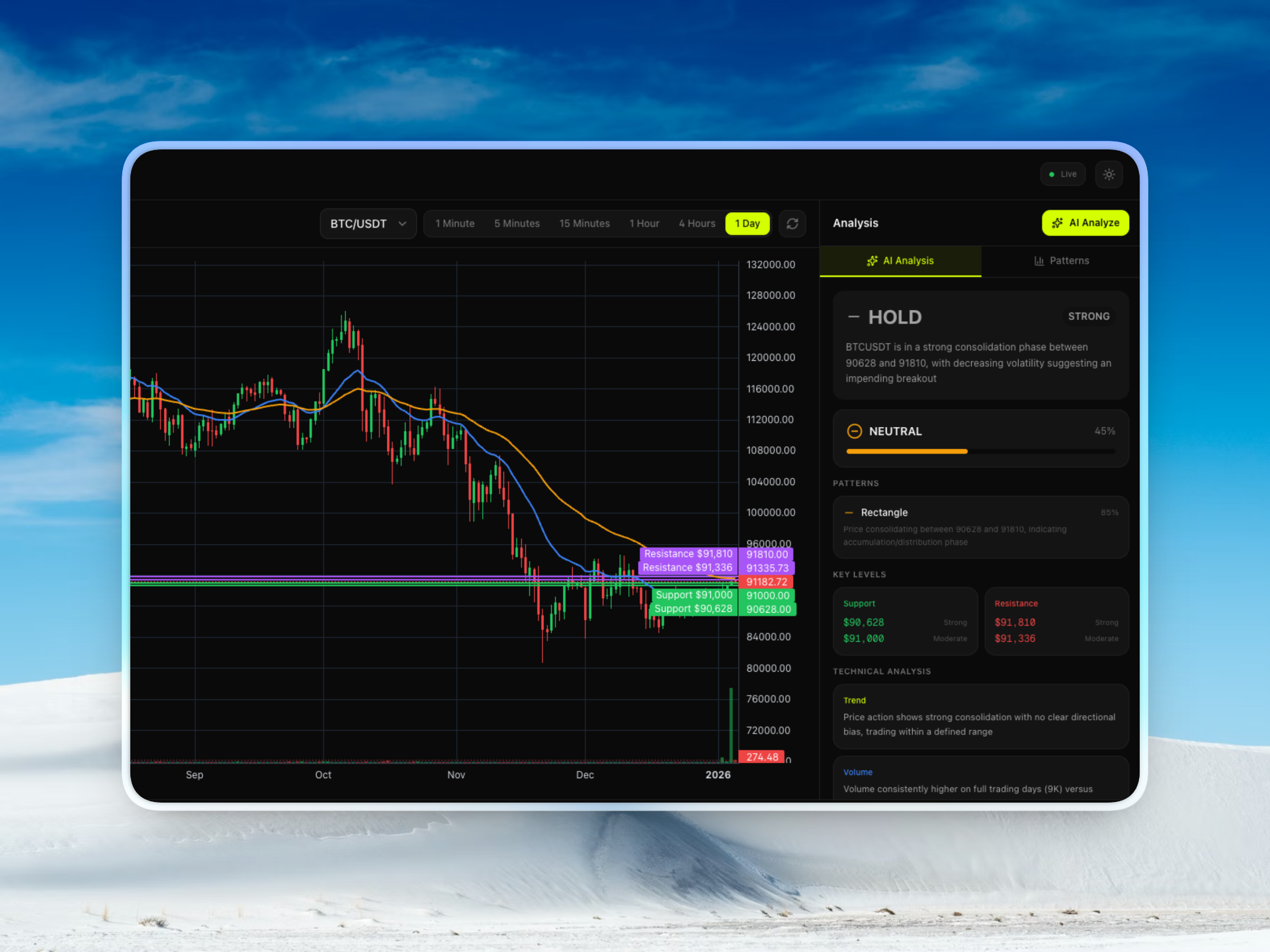 Live price feeds from Binance with WebSocket updates keep your analysis current and actionable.